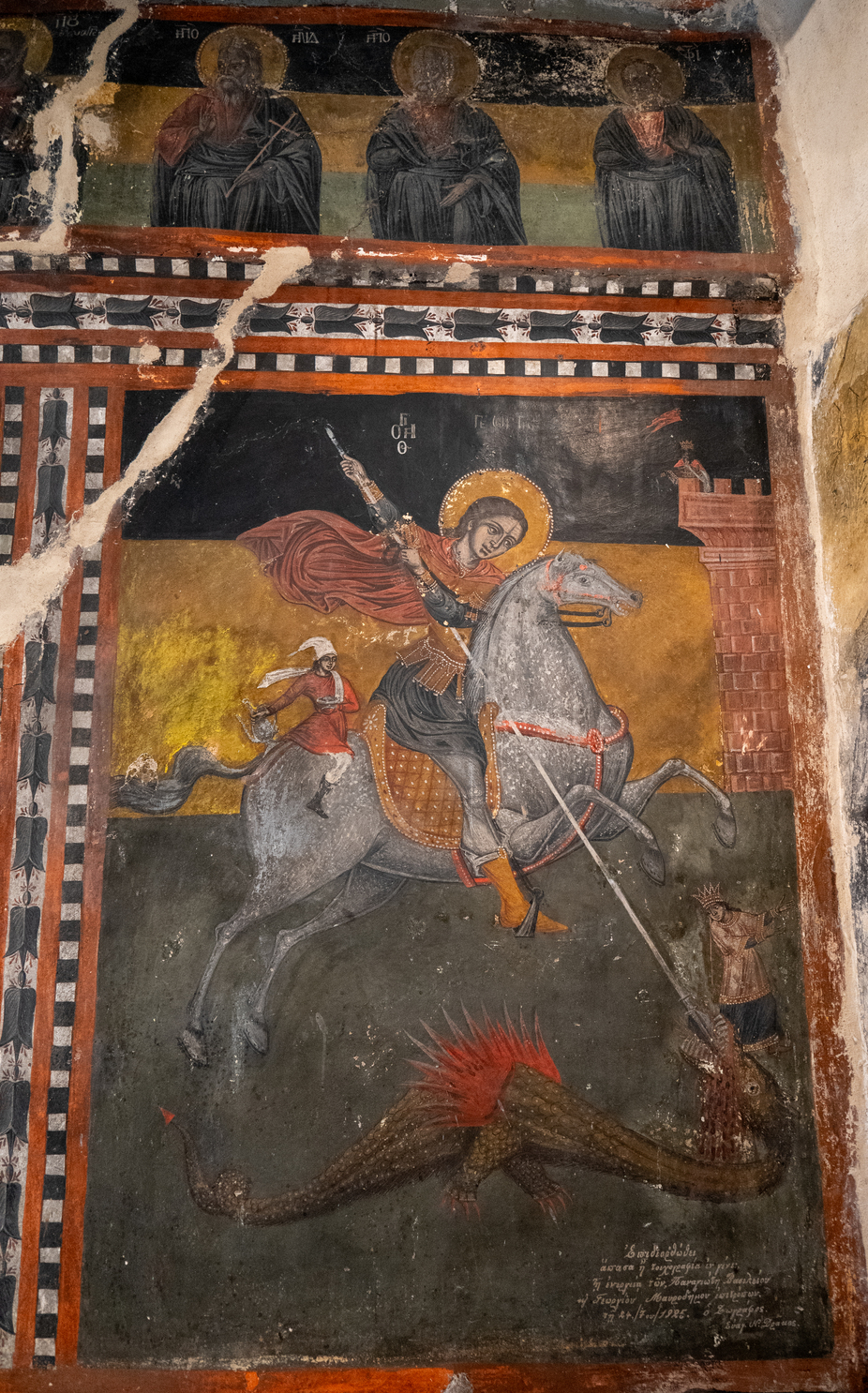 Ανεξάρτητα από το κίνητρο του κτήτορα (που προφανώς είναι θαμμένος στο αρκοσόλιο του νότιου τοίχου), εκείνο που έχει ξεχωριστή σημασία είναι ότι ένας Φλαμανδός στην καταγωγή χορηγός ανέλαβε τη δαπάνη για την ανέγερση ενός κτίσματος που ακολουθεί εξ ολοκλήρου βυζαντινά πρότυπα. Αυτό το γεγονός αποκαλύπτει με τον πιο εύγλωττο τρόπο την ώσμωση που σταδιακά επήλθε μεταξύ των ετερόδοξων πληθυσμών στις περιοχές του ελλαδικού χώρου οι οποίες μετά το 1204 περιήλθαν σε Δυτικούς ηγεμόνες. Η κτητορική επιγραφή που βρέθηκε και διασώζεται μέχρι σήμερα στο εσωτερικό του, στο μέτωπο του αρκοσολίου, που διαμορφώνεται στο κέντρο του νότιου τοίχου (με αρκετά ορθογραφικά λάθη) λέει τα εξής: «Ανηγέρθη ο θύος και πάνσεπτος ναός του αγίου μεγαλομάρτυρος Γεωργίου δηά συνεργείας και πόθου πολλού του θεοσεβεστάτου καβαλάρη μισέρ Αντώνη Ντε Φλάμα. Ο δε τέλος ήλιφεν πολλών μαρτύρων όδε τέλος εύρεν ηστωρή(θη) αυτής παρά Γερμανού ιερομονάχου κε καθηγουμένου κε Νικοδήμου ιερομονάχου τον αυτάδελφον τους ανακενήσαντα των οίκον τούτον: «ετ.στωθ.ινδ Θ’».